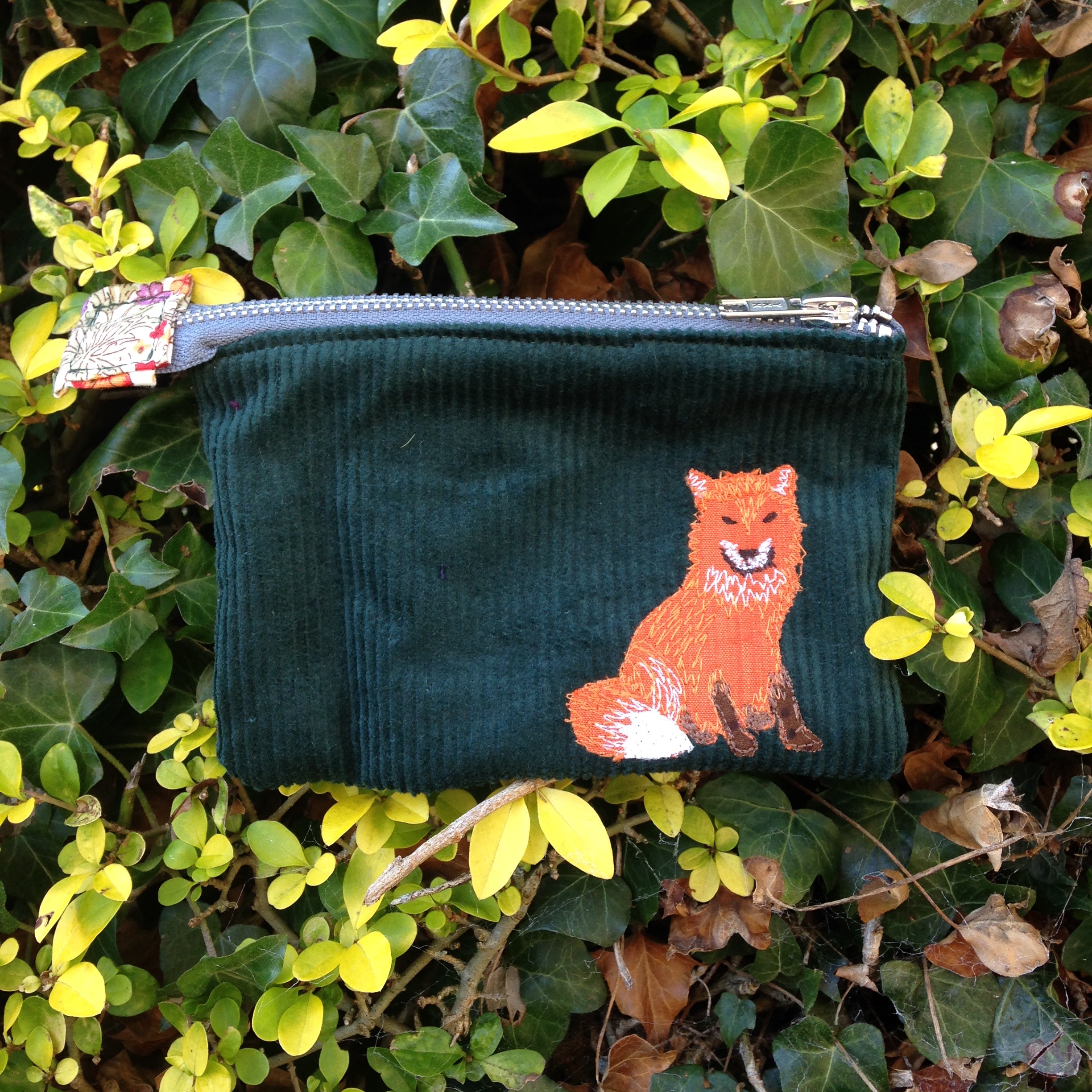 This Fox pouch has been made from green cord with a small fox freehand machine embroidered onto the front. There is also pretty floral fabric lining with a dark grey metal zip enclosing the pouch.