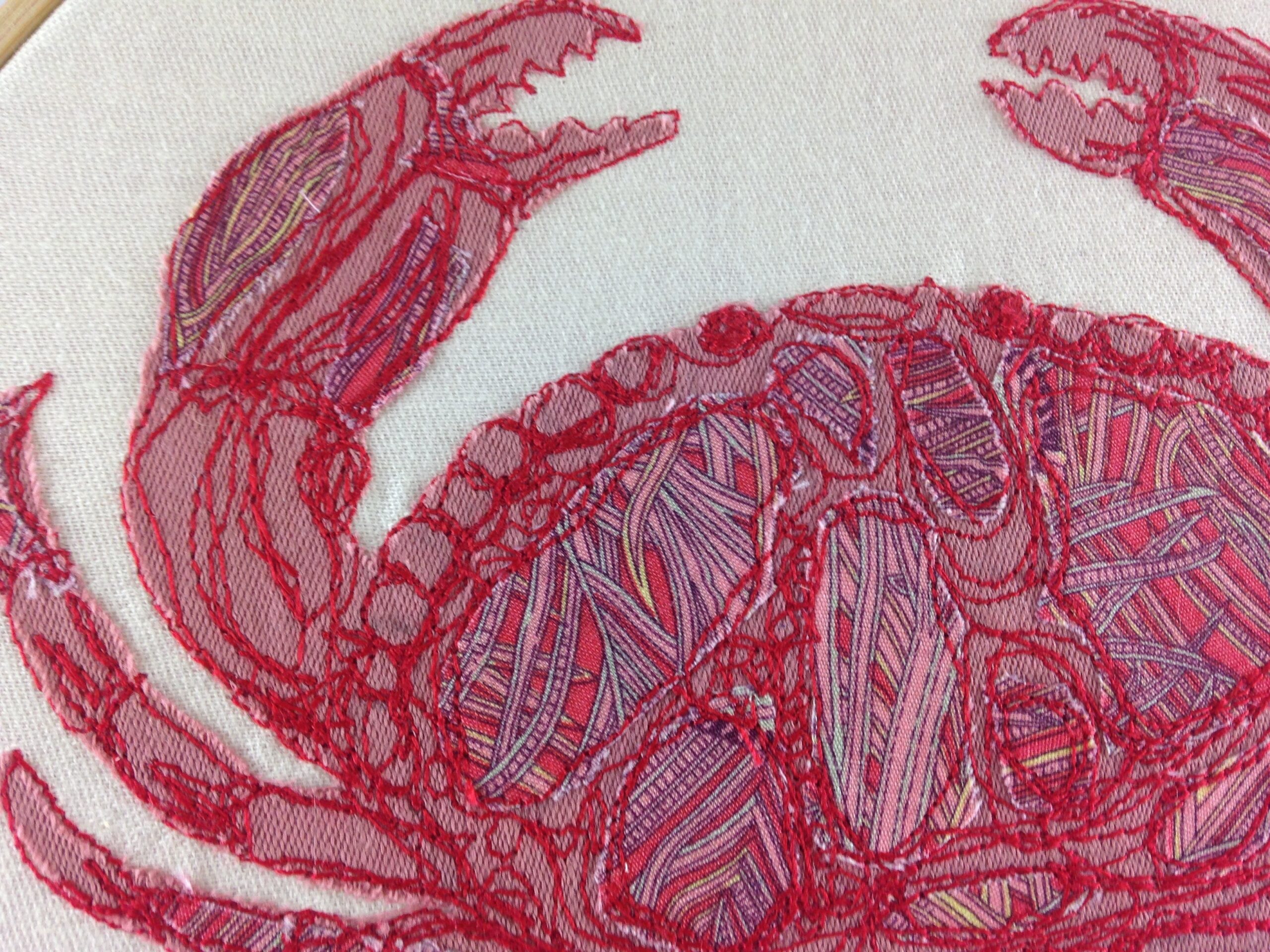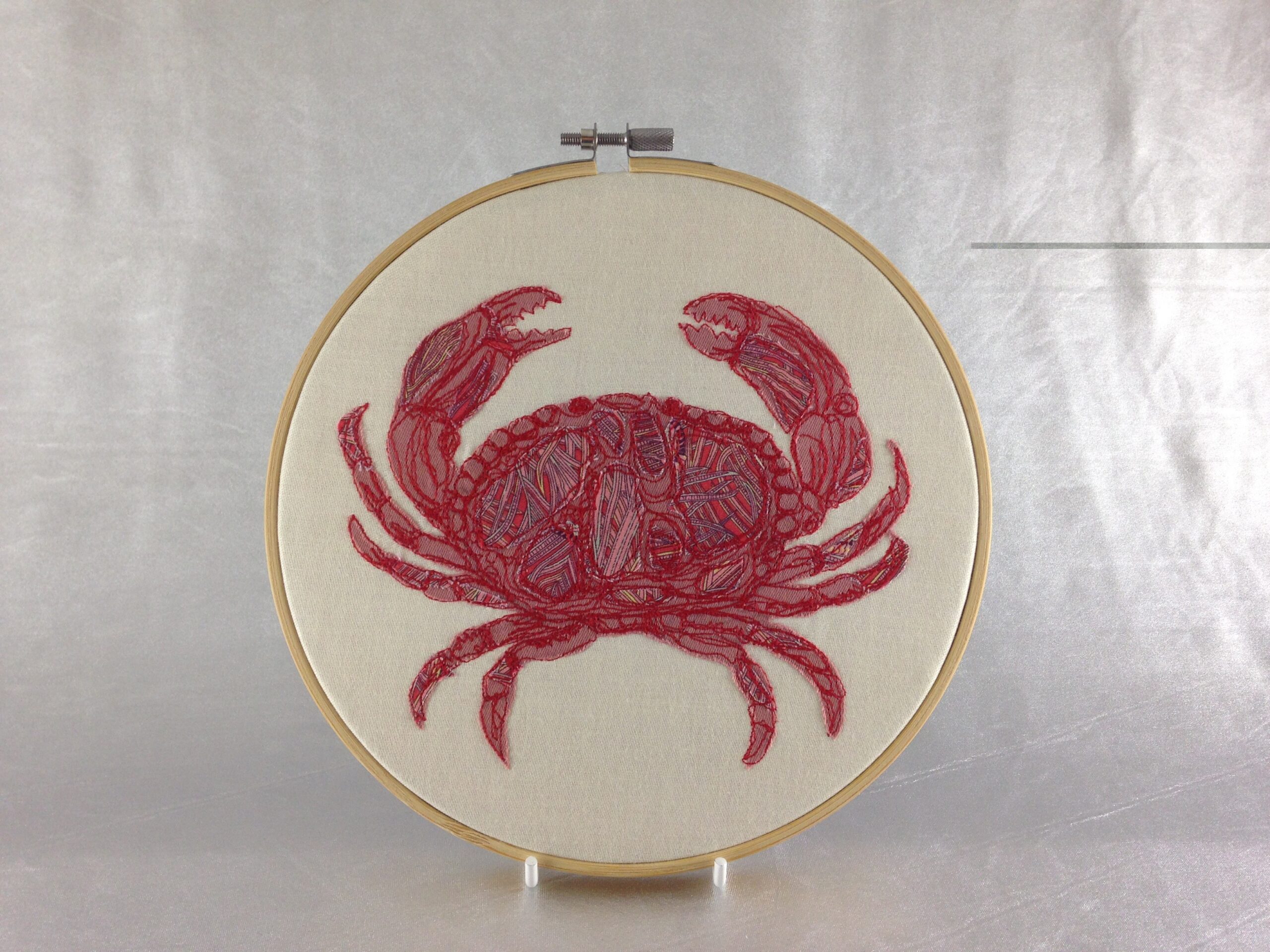 The beautiful accent fabric on this Crab is Liberty of London Peacock pattern and the rest is strong cotton. It is then fixed to the hoop with a bit of extra strong glue and finished off with some ribbon.